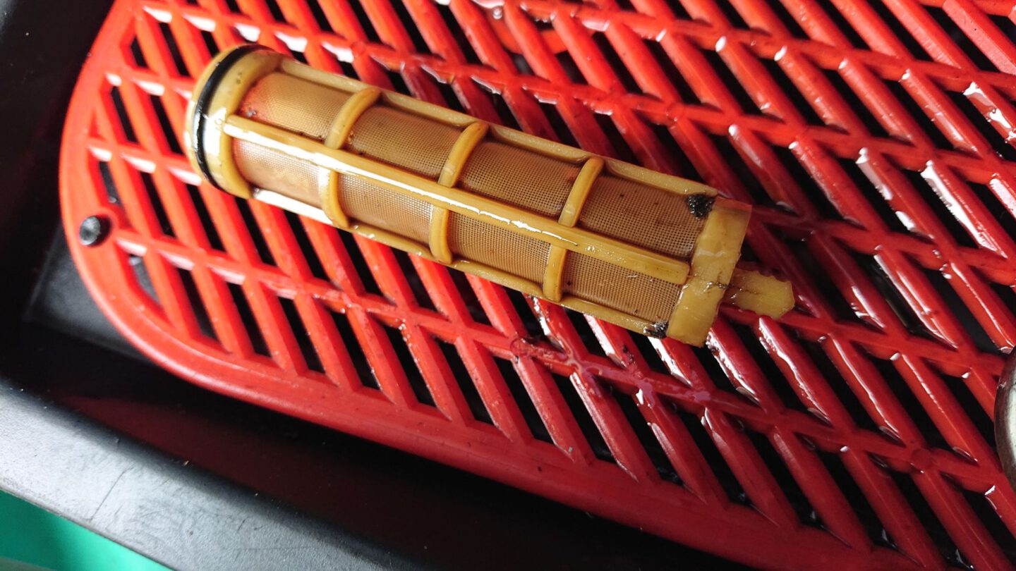 Schritt 4.3: Hinter der Ölablassschraube sitzt ein kleines Plastiksieb als Vorfilter. Dieses herausziehen und mit Bremsenreiniger und dem Tuch reinigen. Danach so ablegen, dass keine Fremdkörper daran haften – also nicht auf den Boden legen!