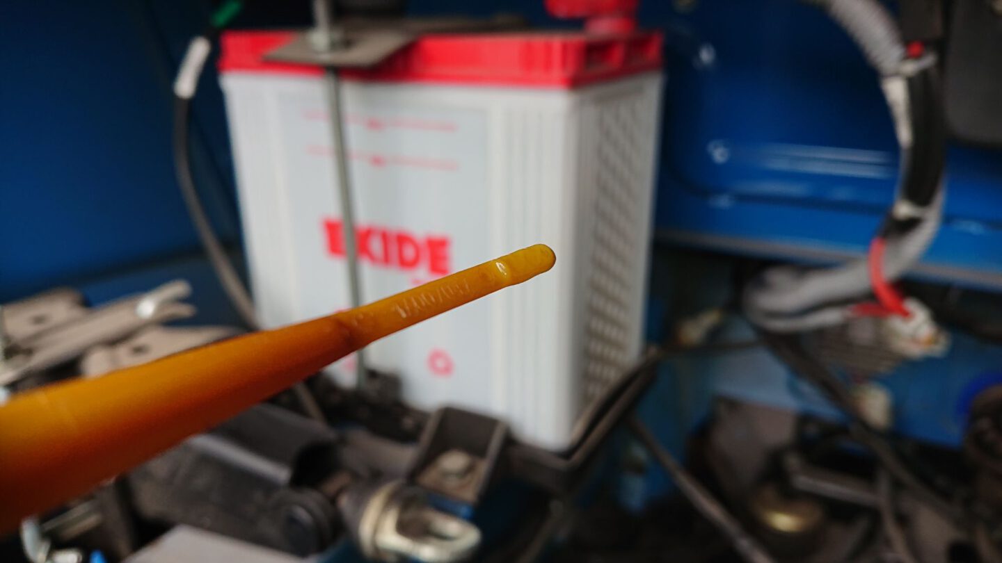 Schritt 6.4: Nachdem das Öl im Motor ist, mit dem Peilstab nachmessen, ob die Menge wirklich stimmt. Der Ölstand sollte in der Markierung des Stabs liegen. Das ist ein wenig schwer auf dem Bild zu erkennen – so ein schönes, durchsichtiges frisches Öl is jetzt im Motor!