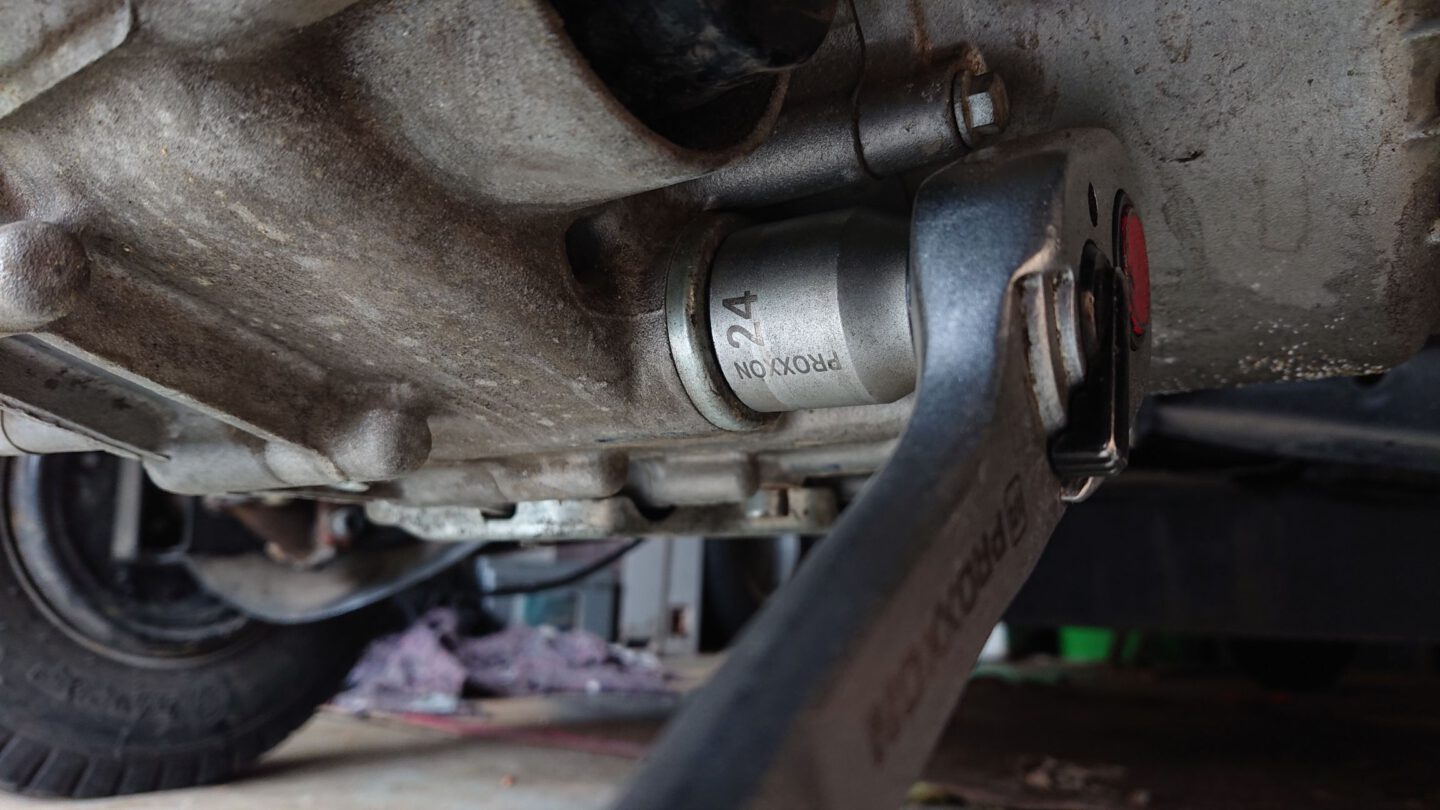 Falls Du auf der linken Seite eine Ölablassschraube findest, lass sie zu! Du würdest Dich wundern, wie schön goldgelb das Öl nach 5000 km noch ist bevor Du dir bewusst wirst, dass Du gerade das Getriebeöl abgelassen hast- und du keinen Plan hast, wie man das wieder hinein bekommt.